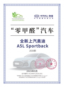 近日,全新上汽奥迪A5L Sportback荣获中汽中心“零甲醛”汽车认证。该认证不仅充分肯定了A5L Sportback在健康安全与豪华品质上的卓越表现,更彰显了上汽奥迪始终践行“以用户为中心”的品牌理念与责任担当。