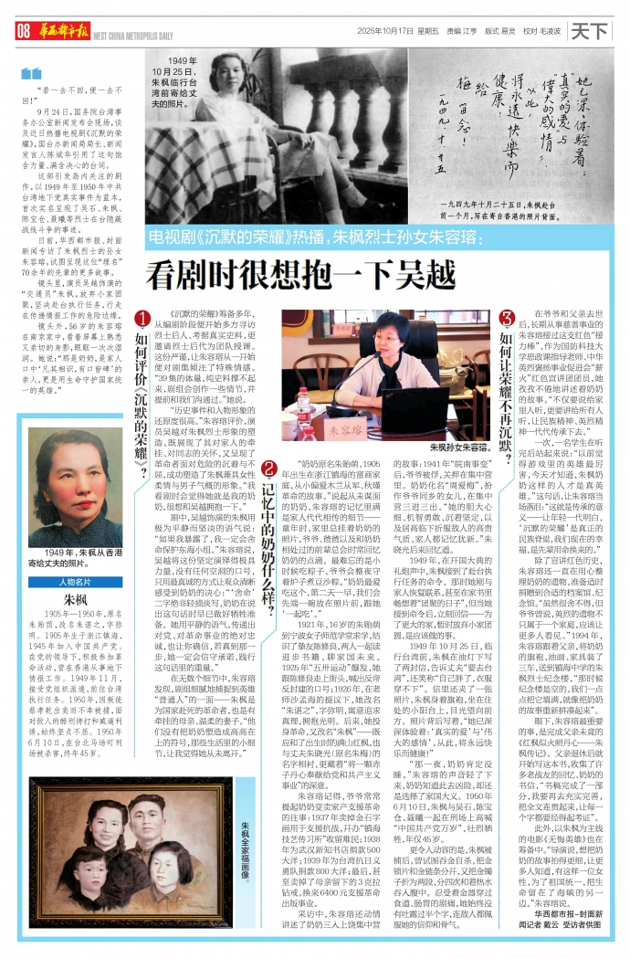 镜头外,56岁的朱容瑢在南京家中,看着屏幕上熟悉又亲切的身影,眼眶一次次湿润。她说:“那是奶奶,是家人口中‘凡其相识,有口皆碑’的亲人,更是用生命守护国家统一的英雄。”