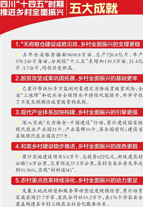 “一是‘天府粮仓’建设成势见效,乡村全面振兴的支撑更稳。”蒋刚说。四川千方百计稳面增产,开展“天府粮仓·百县千片”建设,深化良田、良种、机、良法“四良融合”,去年全省粮食播面9608.8万亩、总产726.8亿斤、单产378.2公斤每亩,分别较“十三五”末增加139.3万亩、21.4亿斤、5.7公斤,均创历史新高。