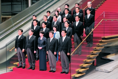 10月21日,日本首相高市早苗(前排中)在东京的首相官邸率阁僚合影。新华社发
