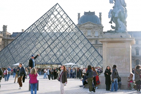 10月22日,在法国巴黎,大量游客聚集在卢浮宫博物馆的玻璃金字塔入口前。 图据新华社客户端
