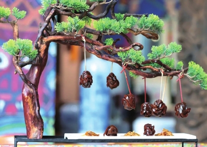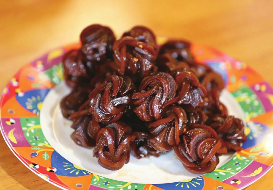 平武套枣成品呈琥珀色,线条流畅、造型精美、玲珑剔透,犹如一件件精雕细琢的艺术品。盛装入盘,恰似“紫莲并蒂叠玉盘”,极具观赏性,令人未尝其味,先醉其形。