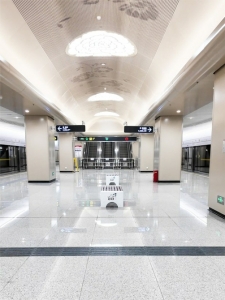 步入新南门站,连续的拱形结构呼应古城门记忆;天花板上芙蓉造型花灯,宛若繁星点点;两侧墙面青蓝渐变如锦江波光,整体氛围简约现代而不失古典韵味。