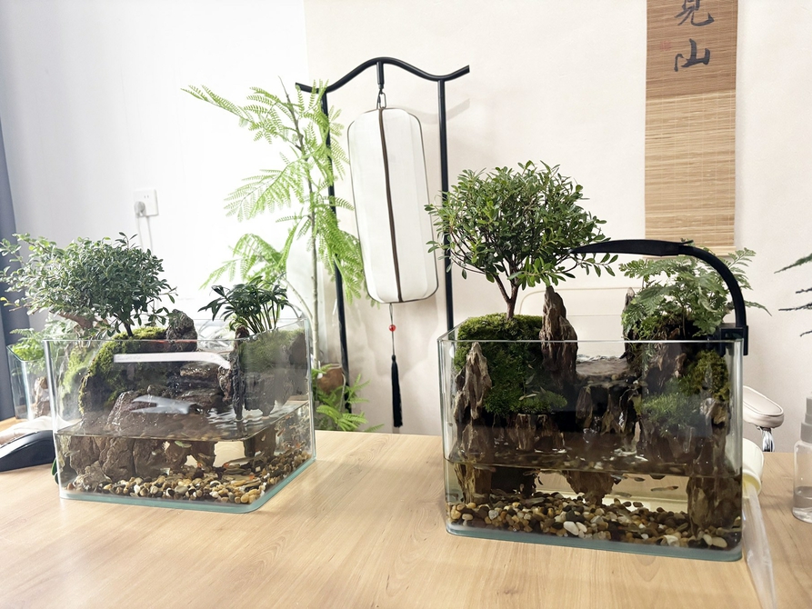 “在花鸟市场很难找到一款集山水、水流、养鱼、苔藓于一体的完整产品,更别说标准化、品牌化运营了。”黄柯说,三年前凭借对市场的敏锐洞察和对绿植美学的独特理解,他们开始在“山水微景观”赛道发力。在他看来,一个小小的山水生态缸,不仅是自然与美学的结合,也为家庭、办公室等空间增添了山水生气与艺术感。