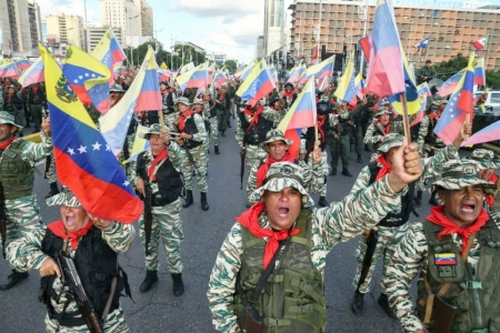 9月23日,在委内瑞拉首都加拉加斯,民兵组织成员挥舞委内瑞拉国旗参加游行。 图据新华社客户端