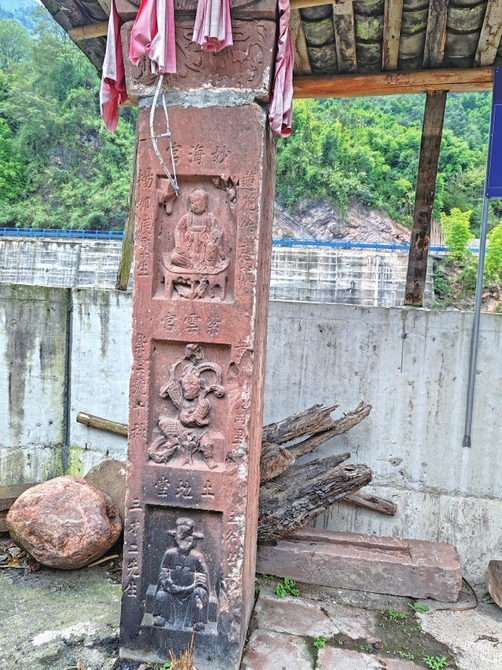 寿相桥的文化价值,还体现在其精美的石雕艺术上。西桥台北侧约五米处,立有三重檐五开间石刻桥碑,仿桥楼形制。正中刻“寿相桥”,上方小方框刻“为善最乐”,两旁刻录捐资者姓名与数额,上面部分字迹因风雨剥蚀已漫漶模糊。间柱刻楹联,如“虹腰高跨川康道,雁齿平分秦汉秋”,既状桥之雄伟,亦溯地方渊源。碑体石雕以传统戏文为题材,人物造型匀称、神态自然,刀工细腻,为研究清代四川戏曲与民俗的重要实物资料。