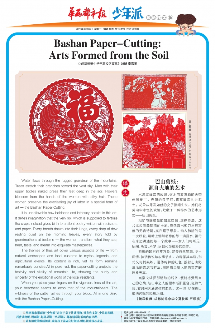 水流过峰峦的峻峭,树木向着浩瀚的天空伸展枝丫。赤膊的汉子们,将双脚深扎进泥土。花朵从秀发如丝的女子指间生长。她们将劳动中永恒的欢愉,贮藏于一种特殊的艺术形式——巴山剪纸。