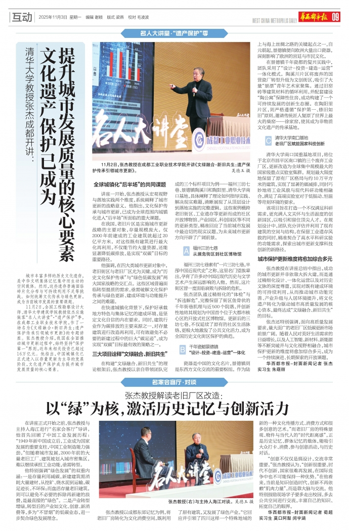 11月2日,全国工程勘察设计大师、清华大学建筑学院教授张杰应邀做客“名人大讲堂”·“遗产保护”季,在成都工业职业技术学院,作了一场名为《文绿融合·新旧共生:遗产保护传承引领城市更新》的专题讲座。张杰教授介绍,我国在全面推动城市更新过程中,始终坚持“保护第一”原则,近年来相关投资已超过16万亿元。他指出,中国城镇化已正式进入以存量更新为主导的发展阶段,文化遗产保护成为提升城市发展质量的核心要素。