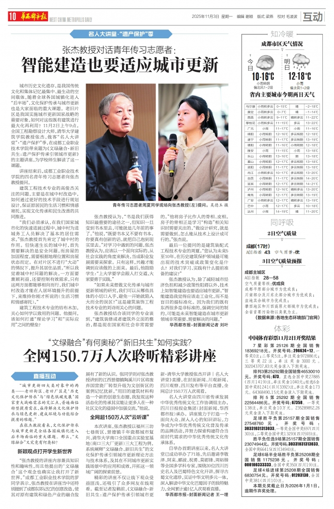 城市历史文化遗存,是我国传统文化和集体记忆最集中、最生动的空间载体,随着全球各国城镇化进入“后半场”,文化保护传承与城市更新也是大家面临的重大课题。老旧片区是我国实施城市更新国家战略的重要对象,如何对这些既有建筑进行最大化再利用?11月2日上午9点,全国工程勘察设计大师,清华大学建筑学院教授张杰,做客“名人大讲堂”·“遗产保护”季,在成都工业职业技术学院带来题为《文绿融合·新旧共生:遗产保护传承引领城市更新》的主题讲座,为学校师生解读了这一课题。