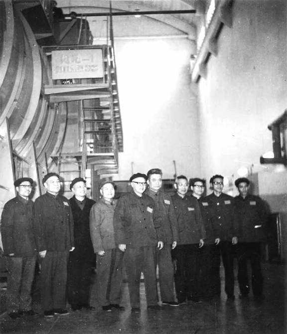 “两弹一星”元勋邓稼先(右五)、王淦昌(右六)、程开甲(右七)等在梓潼基地。 四川省档案馆藏