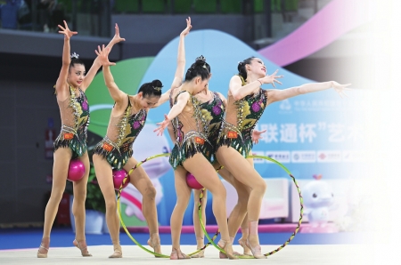 11月10日,艺术体操集体全能决赛举行,图为四川队选手在3球2圈比赛中。 新华社发