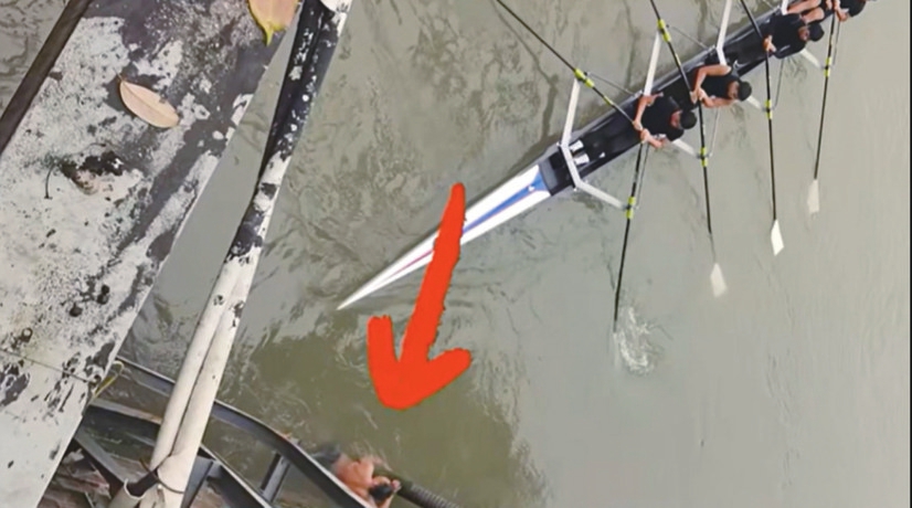 由于老人所在的区域水流复杂,空间狭小,他们先是朝老人抛去救生圈,可惜被水流卷走,老人此时也失去了抓住救生圈的力气。灵机一动,他们尝试将赛艇倒插进漩涡中进行救援。