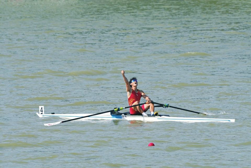 11月10日,第十五届全运会迎来开幕式后的首个比赛日,上午在广州国际划船中心进行的赛艇比赛中,今年24岁的四川选手谷建滔获得男子轻量级单人双桨冠军。