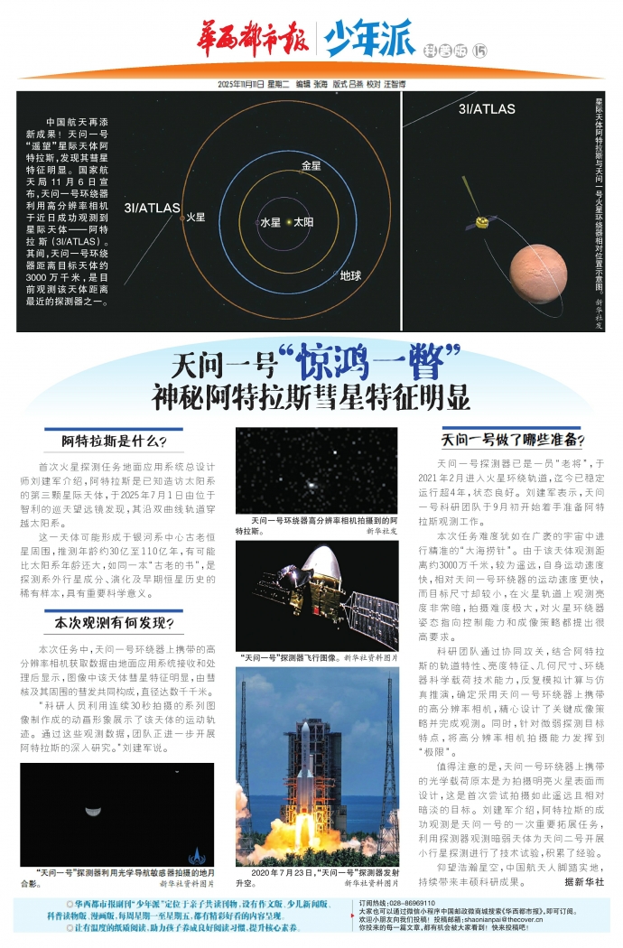 中国航天再添新成果!天问一号“遥望”星际天体阿特拉斯,发现其彗星特征明显。国家航天局11月6日宣布,天问一号环绕器 利用高分辨率相机于近日成功观测到星际天体——阿特拉斯(3I/ATLAS)。其间,天问一号环绕器距离目标天体约3000万千米,是目 前观测该天体距离最近的探测器之一。
