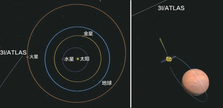 星际天体阿特拉斯与天问一号火星环绕器相对位置示意图。新华社发