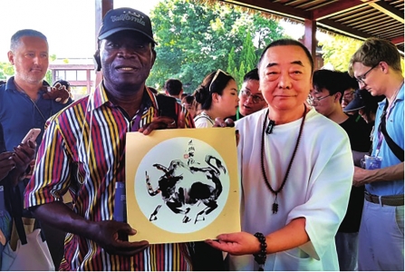 林栩向外国友人赠送“指画”作品。图据峨眉山文化馆
