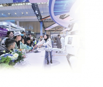 前来参观的学生体验机器人售货。伍雪梅 摄