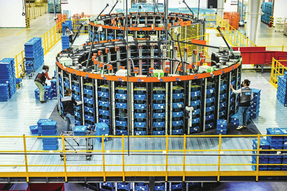 11月4日,在成都市一家快递企业中转场,工作人员在“旋风播”快件自动化智能分拣流水线上分拣快递包裹。图据新华社客户端
