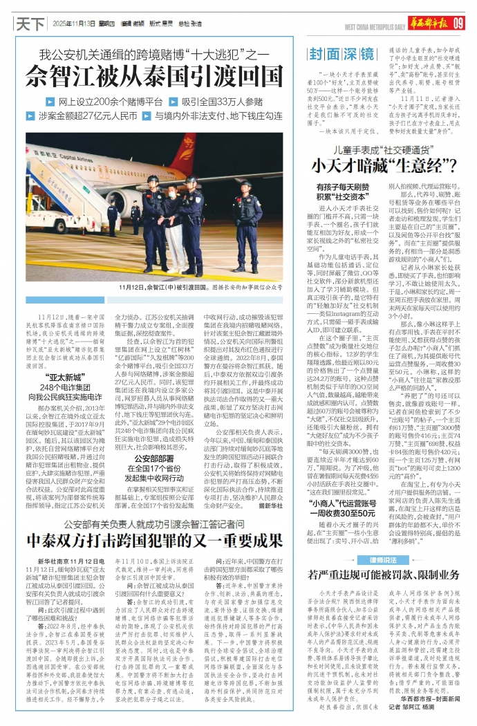 11月12日,随着一架中国民航客机降落在南京禄口国际机场,我公安机关通缉的跨境赌博“十大逃犯”之一——缅甸妙瓦底“亚太新城”赌诈犯罪集团主犯佘智江被成功从泰国引渡回国。