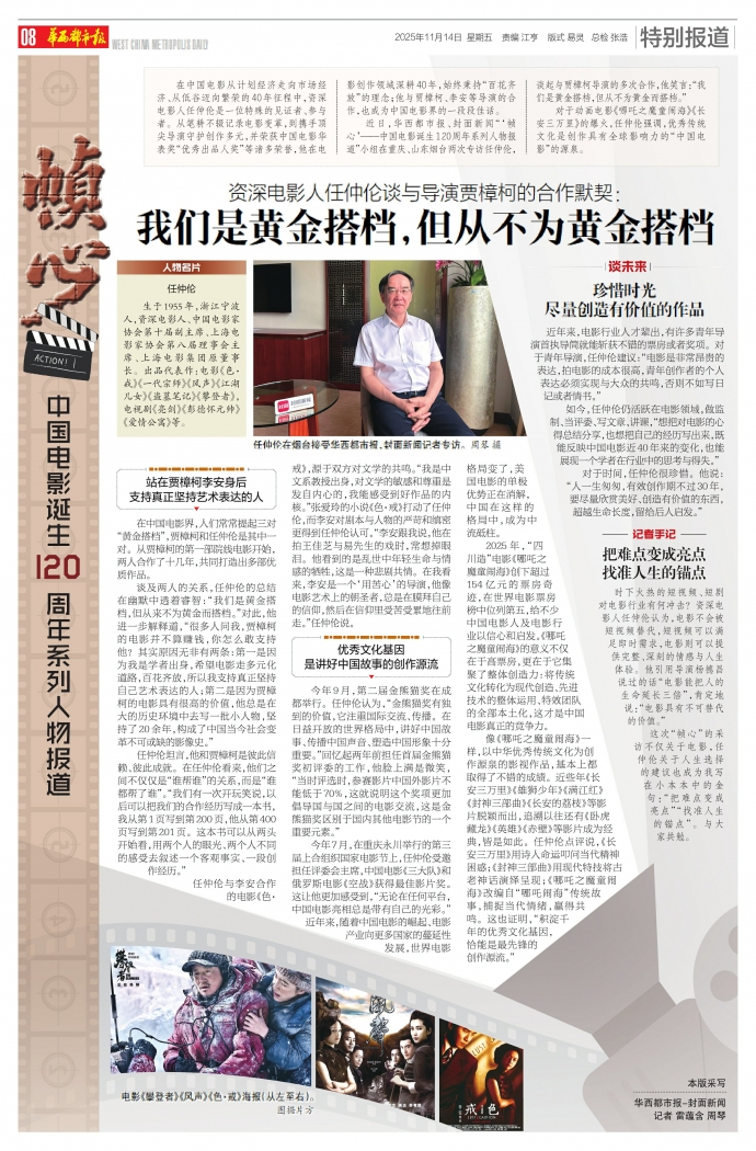 近日,华西都市报、封面新闻“‘帧心’——中国电影诞生120周年系列人物报道”小组在重庆、山东烟台两次专访任仲伦,谈起与贾樟柯导演的多次合作,他笑言:“我们是黄金搭档,但从不为黄金而搭档。”