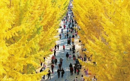 11月15日,成都迎来了久违的晴天。游客在成都彭州市通济镇三明路游玩赏景(无人机照片)。 新华社发