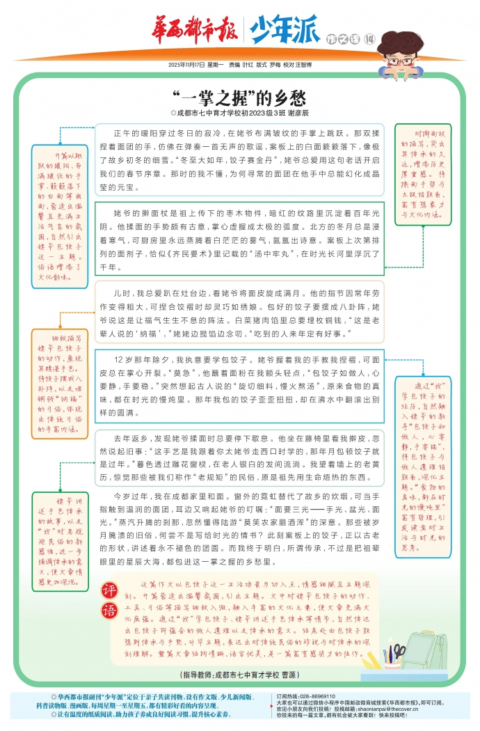 这篇作文以包饺子这一生活场景为切入点,情感细腻且主题深刻。开篇营造出温馨氛围,引出主题。文中对姥爷包饺子的动作、工具、习俗等描写细致入微,融入丰富的文化元素,使文章充满文化底蕴。通过“我”学包饺子、姥爷讲述手艺传承等情节,自然传达出包饺子所蕴含的做人道理以及传承的意义。结尾处由包饺子联想到传承与乡愁,升华主题,表达出对传统民俗的珍视与对传承的深刻理解。整篇文章结构清晰,语言优美,是一篇富有感染力的佳作。