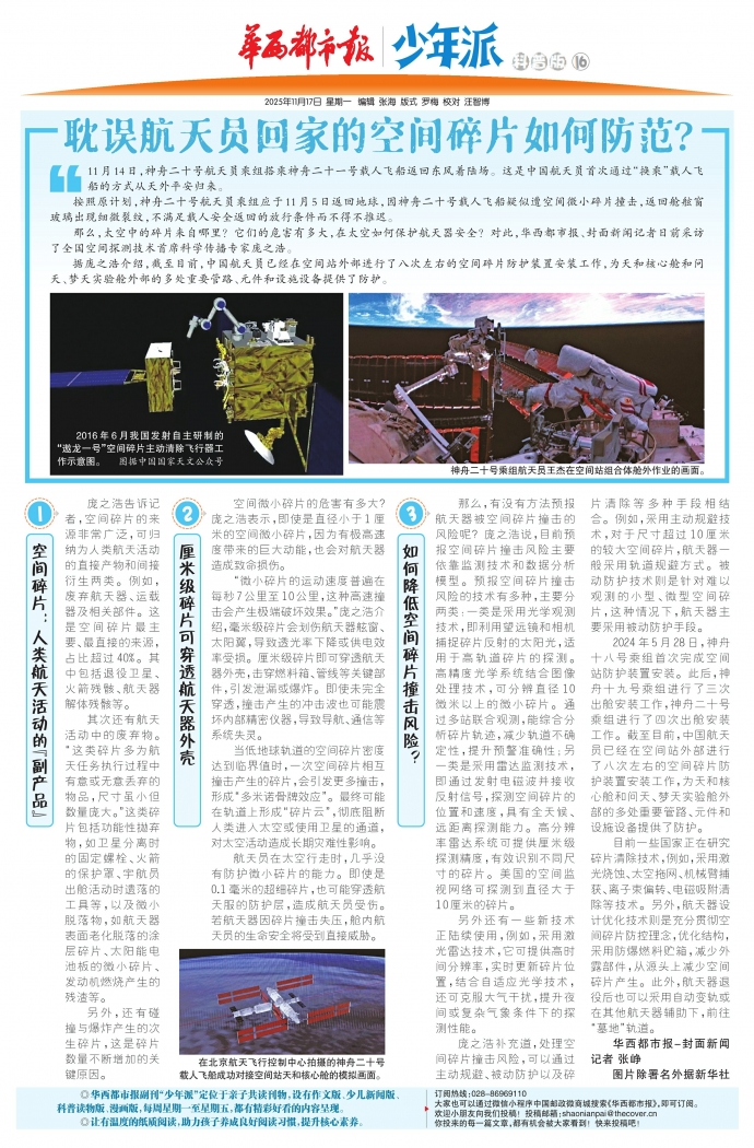 航天员在太空行走时,几乎没有防护微小碎片的能力。即使是0.1毫米的超细碎片,也可能穿透航天服的防护层,造成航天员受伤。若航天器因碎片撞击失压,舱内航天员的生命安全将受到直接威胁。
