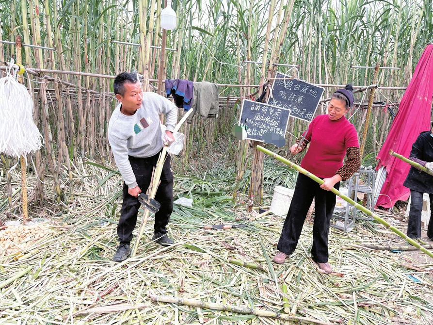 童鹏飞(左)在甘蔗地里削甘蔗,后面黑板上写有“偷”甘蔗的广告语。