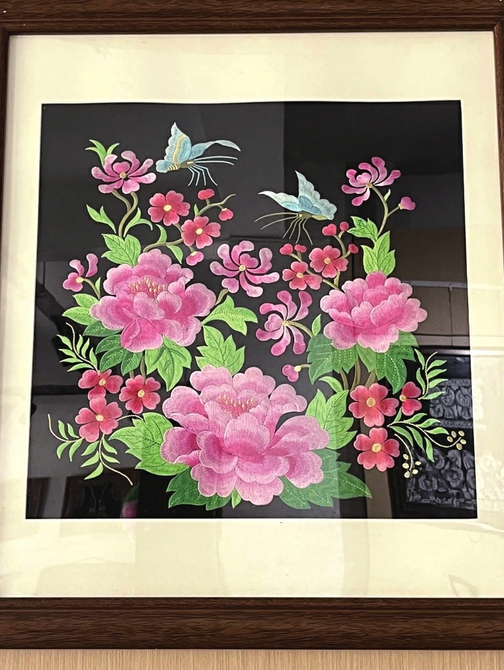 为此,陈云珍在继续创作传统羌绣作品的基础上,重新开始设计、绘制纹样。她将羊角花的纹样与云纹结合,创作出了“云朵上的羊角花”;她在一幅羌绣画中展现出羊角花盛开与即将凋谢的两种形态,又加上代表多子多福的石榴花,以丰富整个画面。“在大自然中,羊角花的形态和颜色本身就多样,有紫色、粉色的,也有白色、黄色的。”这些改变过的纹样,根据不同面料的特征再进行微调,从而追求更好的视觉效果。
