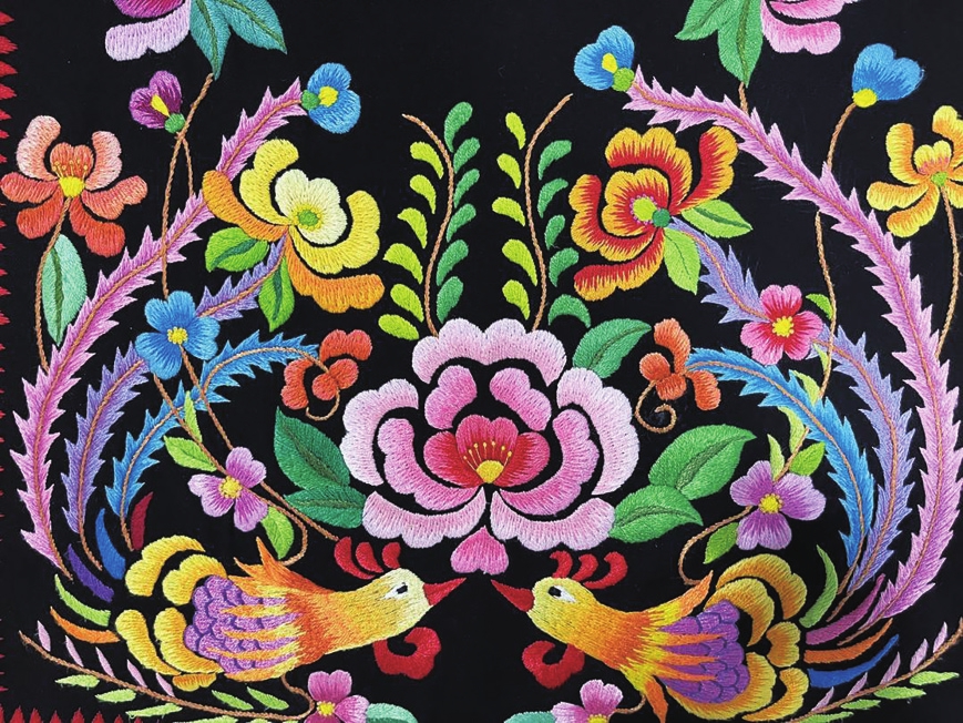 而在绣法上,羌绣有边针绣、单边绣、双边绣、单钩绣、双钩绣、起针绣、穿针绣等,常用的就有近二十种。桃红、绿色、粉红、大红色、金黄色、天蓝色等颜色的棉线交织,呈现出色彩鲜艳跳脱的效果。