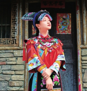 陈云珍的女儿杨红莉穿着母亲绣制的服装。 受访者供图