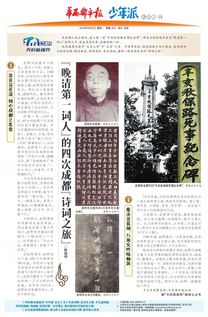在成都人民公园内,矗立着一座“辛亥秋保路死事纪念碑”,碑身北面的题字出自“晚清第一词人”赵熙之手,笔法秀逸朴厚,风格独树一帜。