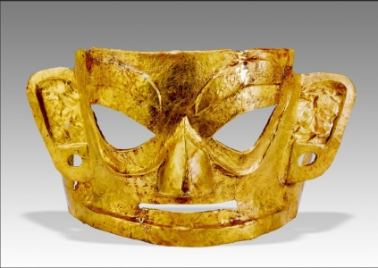 无独有偶,在成都金沙遗址,同样出土了规模较大的薄片状黄金制品。令人瞩目的金沙黄金面具,鼻子高挺,双眼镂空约呈菱形,耳垂穿孔,造型风格与三星堆金面具颇为相似。除金面具外,金沙遗址亦发现鱼形饰、圆片饰等三星堆同款金器。