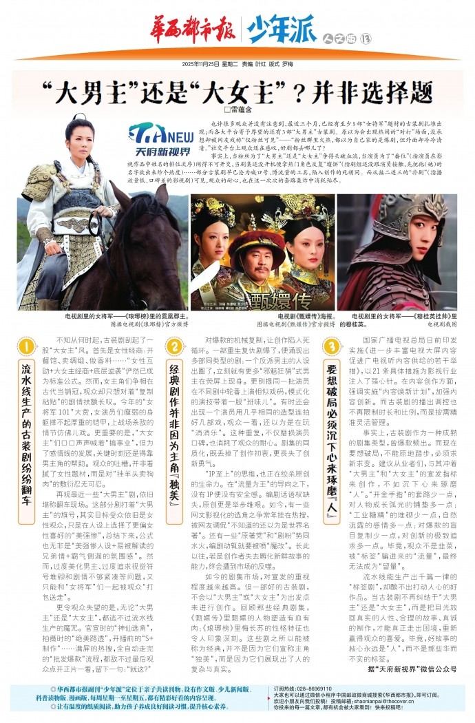 流水线能生产出千篇一律的“标签剧”,却酿不出打动人心的好作品。当古装剧不再纠结于“大男主”还是“大女主”,而是把目光放回真实的人性、合理的故事、真诚的制作,才能真正走出困境,重新赢得观众的喜爱。毕竟,好故事的核心永远是人”,而不是那些华而不实的标签。