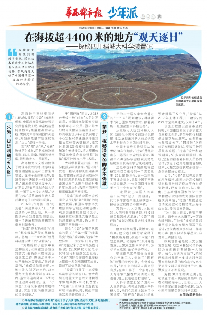 观“天”需“地”利。“拉索”选址历时6年,团队成员跑遍青海、四川、云南、西藏等地考察,最终选定四川稻城县。