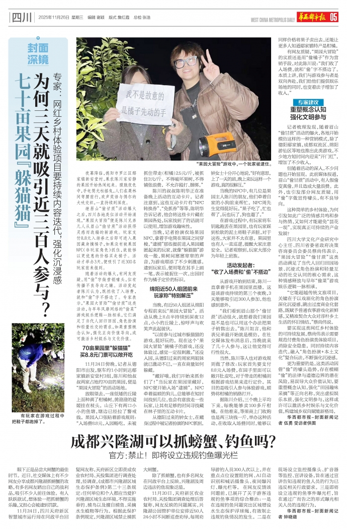 眼下正是品尝大闸蟹的最佳时节。近日,社交媒体上有不少网友分享成都兴隆湖抓螃蟹的攻略,有多名网友晒出自己的战利品,吸引不少人前往体验。有人跃跃欲试,想体验一把抓螃蟹的乐趣,又担心会被逮到罚款。