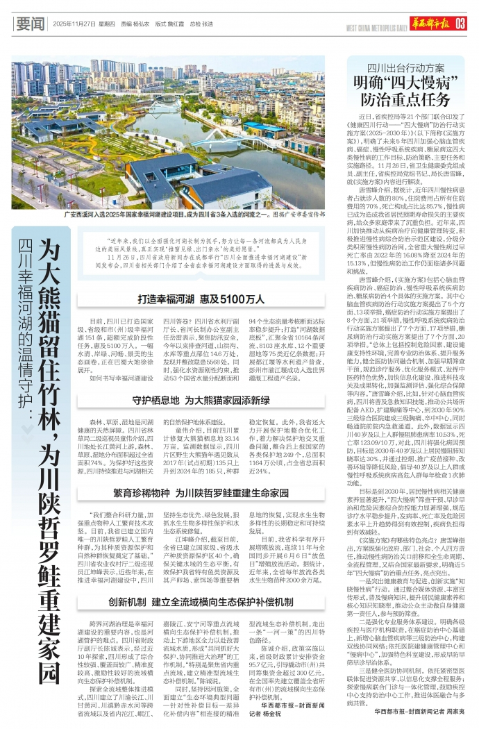 唐雪峰介绍,据统计,近年四川慢性病患者占就诊人数的80%,住院费用占所有住院费用的70%,死亡构成占比达85.7%,慢性病已成为造成我省居民预期寿命损失的主要疾病,给众多家庭带来了沉重负担。近年来,四川加快推动从疾病治疗向健康管理转变,积极推进慢性病综合防治示范区建设,分级分类织密慢性病防治网,全省重大慢性病过早死亡率由2022年的16.08%降至2024年的15.13%,但慢性病防治工作仍面临诸多问题和挑战。