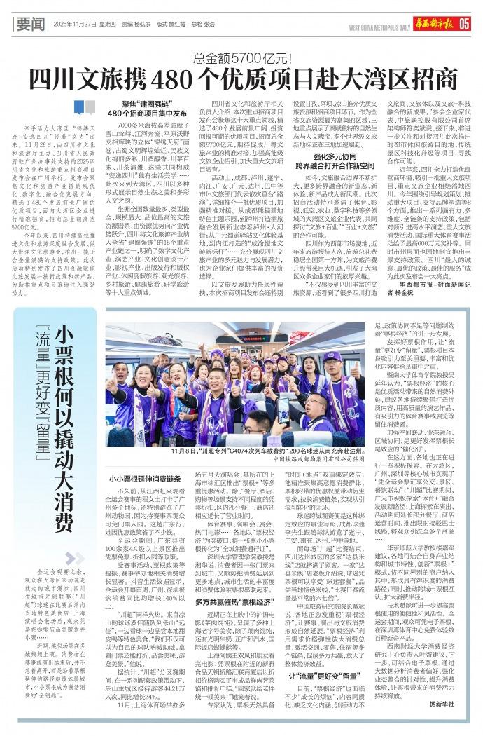 全运会观赛之余,观众在大湾区来场说走就走的城市漫步;四川省城市足球联赛(“川超”)球迷在比赛后涌向当地特色美食店;上海演唱会散场后,观众凭票在咖啡店品尝赠饮并小聚……