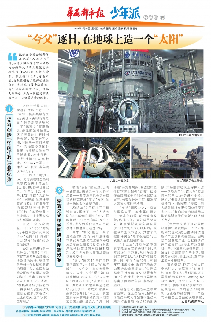 EAST正在进行新一轮升级。“明年2月前,它将完成加热系统和水冷系统的改造,继续服务于新一代核聚变装置的预研工作。”中国科学院合肥物质科学研究院副院长、等离子体物理研究所所长宋云涛说,“在提高原始创新能力上持续用力,在突破关键核心技术、前沿技术上抓紧攻关,这个‘太阳’正年轻。”