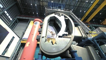 “夸父”园区11号厂房巨型的穹顶下,一个硕大的“橘子瓣”——八分之一真空室静卧中央。未来,八个“橘子瓣”将精准拼接,构成下一代“人造太阳”的核心舱室。“从预研、研制、调试到正式建成并通过验收,我们历时十年攻关,形成40余项发明专利。”八分之一真空室及总体安装系统负责人刘志宏自豪地说,最近几个月,“橘子瓣”旁愈加热闹,偏滤器原型件给它装上超强“盾牌”,遥操作系统测试平台的机械臂徐徐展开,如夸父伸出巨臂,精准探入装置内部进行检测。