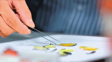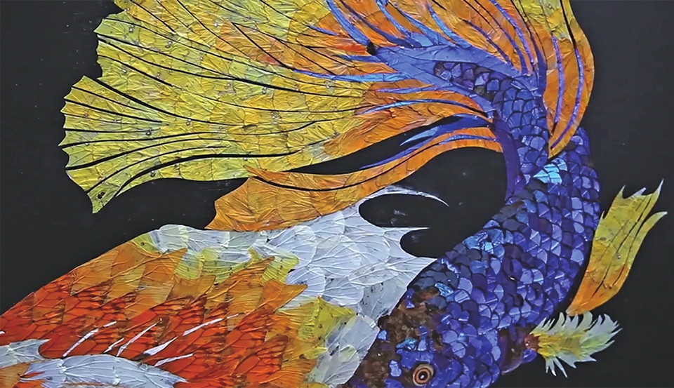 泸州蝴蝶画制作过程堪称耐心的极致体现。蝴蝶翅膀有些小若米粒,有些纹饰如彩绘玻璃,匠人首先将蝶翅按尺寸与色泽分类,再用竹镊与自制米浆,将万千蝶翅碎片在宣纸上精心排布。制作一幅作品往往需耗费500片蝶翅与三周心血。