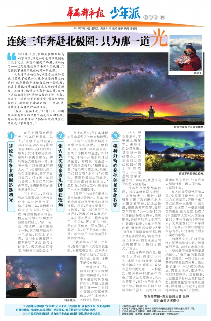 “我会一直拍下去。”11月18日,刚刚从北极圈归来的许晓平接受华西都市报、封面新闻记者专访,“2026年欧洲日食已经让我非常期待了。”