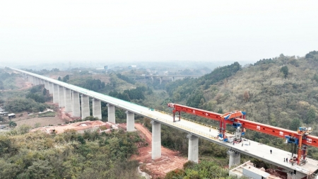 成渝中线高铁4标467孔正线箱梁架设施工现场。中铁三局供图