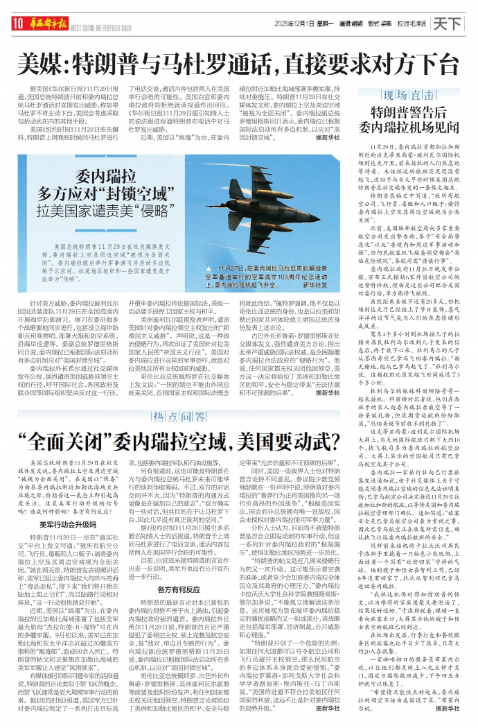 美国总统特朗普11月29日在社交媒体发文称,委内瑞拉上空及周边空域“被视为全面关闭”。委内瑞拉随后举行军事演习并启动多边机制予以应对。拉美地区组织和一些国家谴责美方此举为“侵略”。