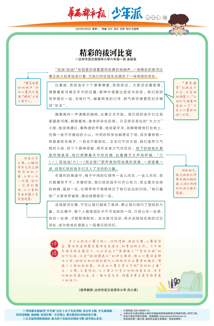 本文以拔河比赛为核心,结构清晰、脉络完整,从赛前准备、赛场角逐到赛后感悟层层递进,叙事流畅自然。文中细节描写极具感染力,无论是选手“紧握绳子”“身体后倾”的动作刻画,还是“脸涨得通红”的神态捕捉,都让比赛场景鲜活立体;啦啦队的呐喊助威则从侧面烘托出赛事的激烈,增强了文章的画面感。结尾由比赛本身升华到“团结的力量”这一主题,立意深刻,让文章不仅有生动的场景呈现,更有积极的思想内涵,是一篇内容充实、情感真挚且富有教育意义的佳作。