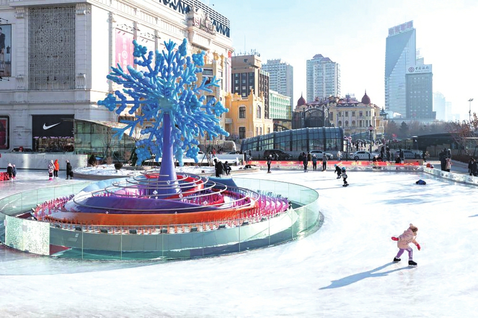 在哈尔滨市南岗区一处公益冰场,人们在“冰雪之冠”雕塑旁滑冰。