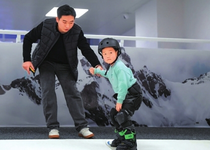 在成都凯德天府广场一家滑雪体验店里,小朋友在教练指导下练习滑雪。