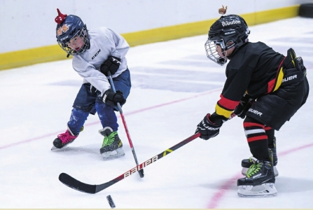 小朋友在湖北省武汉市冰龙冰上运动中心学习冰球。