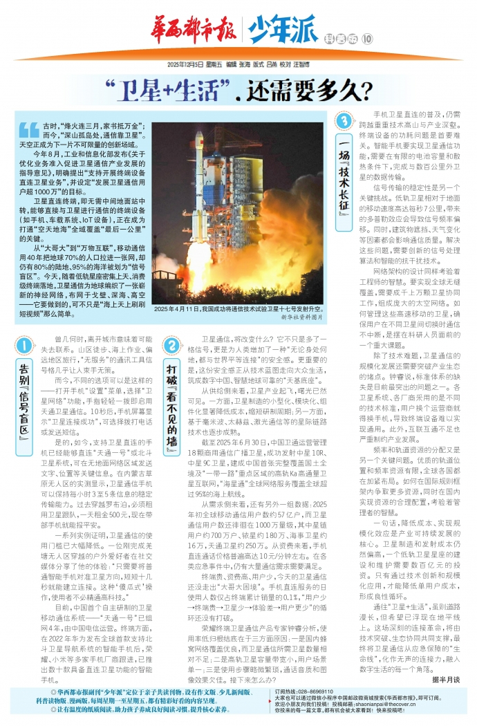 通往“卫星+生活”,虽则道路漫长,但希望已浮现在地平线上。这场深刻的连接革命,将由技术突破、生态协同共同支撑,最终将卫星通信从应急保障的“生命线”,化作无声的连接力,融入数字生活的每一个角落。据半月谈