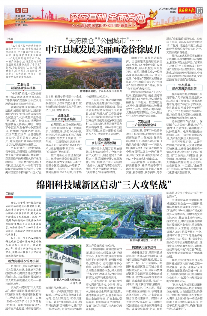 “工业园区投产的功率继电器每天发往全球,德中快通车流穿梭不休,中江挂面村景区游人如织,高标准农田里麦浪翻涌……”走进四川德阳市中江县,一幅产城融合、生态宜居的县域发展画卷正徐徐展开。“十四五”期间,中江县锚定“工业兴县、城建优县、农业固县、文旅活县、生态美县”五大思路,交出了一份厚重的高质量发展答卷。